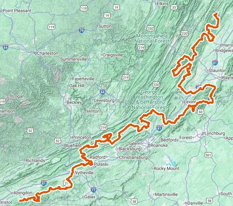 • It runs south to north, starting near the Virginia/North Carolina line (around Damascus, VA) and finishing near the Virginia/West Virginia line (near Fulks Run, VA).