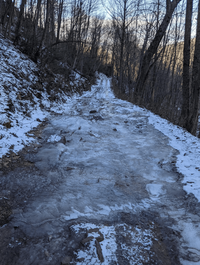 Water plays an equally important role. Many Virginia trails cross natural seeps, springs, and shallow streams. In winter, slow-moving water spreads across packed dirt and exposed rock, freezing into thin sheets of ice that are nearly invisible until your tires begin to slide. Unlike mud, which may eventually allow tires to bite, ice offers no forgiveness. Lockers, airing down, and aggressive tread patterns provide little help when rubber meets frozen rock.